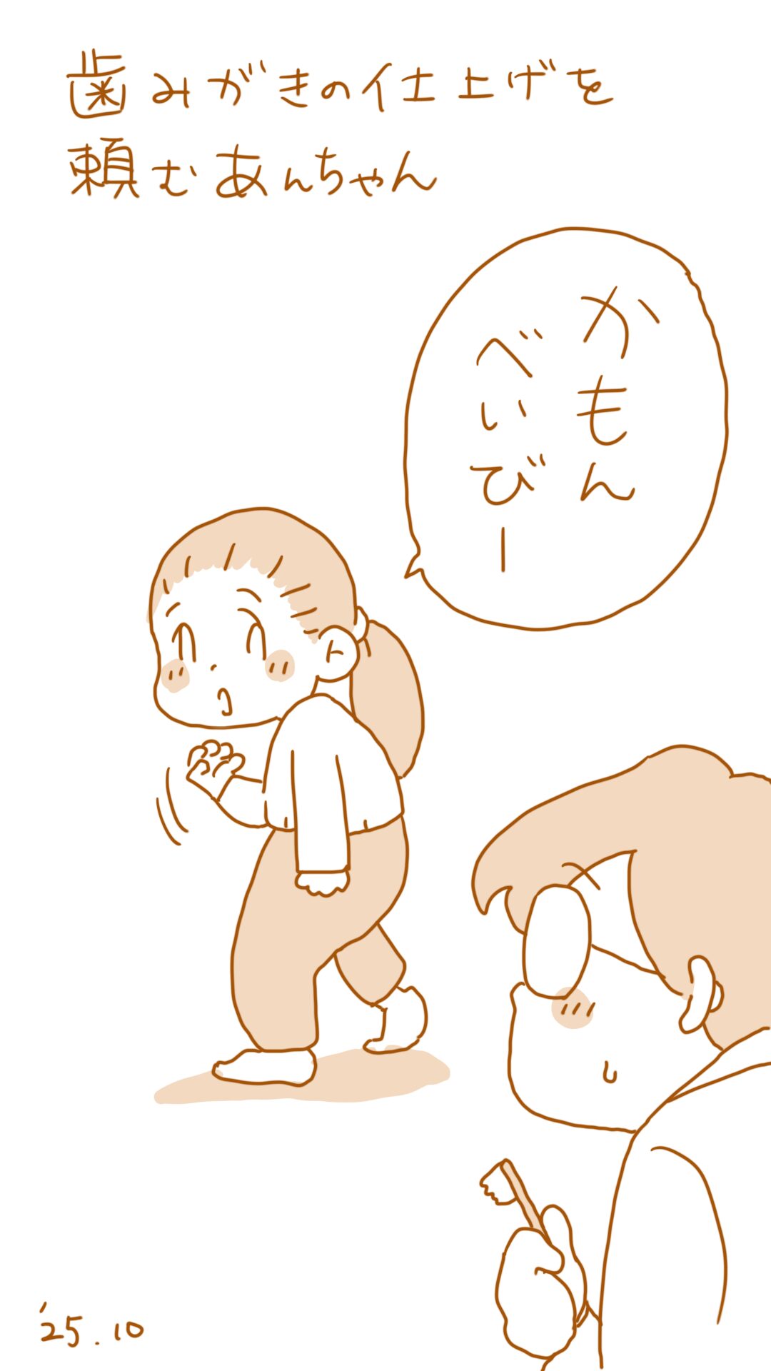 姉弟絵日記 2025.10.19 姉弟絵日記 絵日記, 育児 小学2年生の姉(あんちゃん)と 年少さんの弟(たーたくん)の 一コマ絵日記です。 本日はこちら 歯磨きの仕上げは大抵パパがします。 だけど、パパのことをなめてるあんちゃんは パパのことを呼びつけます🥺 あんちゃんにとっては 仕上げをやってもらう、というよりも パパにやらせてあげる って感じなのかしら🫣 0 コメントはこちら 同じカテゴリの記事 姉弟絵日記 YouTuberごっこ 小学生になって… 弟のひとり遊び(5月5日) 運転手さんごっこ(3月25日) 弟の歌と姉(3月24日) 寝る前のルーティン(3月1日) 雨上がりのバス停(2月17日) 姉を探す弟たーた(2月12日) キョウダイっていいな(2月7日) たーた予防接種へ行く②(2月5日) 我が家のオリジナル節分(2月4日) 鬼襲来!弟の思わぬ行動(2月3日) 嬉し楽しいカツ丼競争(1月31日) たーた予防接種へ行く①(1月29日) 「がんばるじょー」集(1月28日) ママへのマッサージ(1月27日) 癒されぬお風呂での出来事1月25日 朝の日課(姉)1月24日 美容院ごっこ1月23日 弟の隠れ場所1月22日 姉弟絵日記1月21日 姉弟絵日記1月20日 姉弟絵日記1月19日 姉弟絵日記1月18日 姉弟絵日記 姉弟絵日記 姉弟絵日記 前の記事 外食も楽ではないと知って欲しい 2025.06.17 次の記事 記事がありません アプリなら通知ですぐ読める! NAPBIZブログ